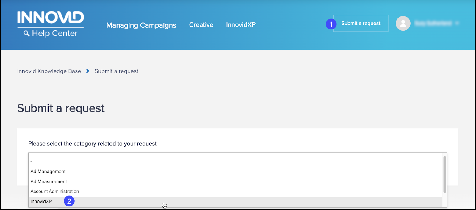 - In the Innovid Help Center, select Submit a Request (located in the top right corner).