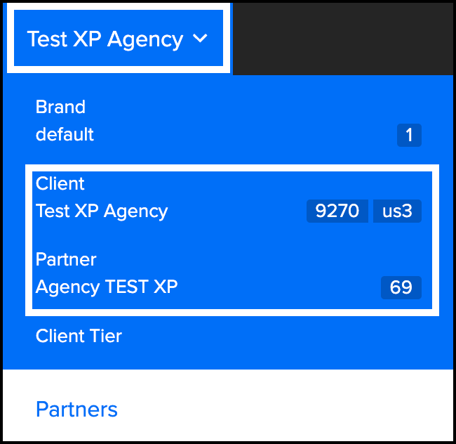 Some request types require IDs to help the Technical Services team identify the correct portal; these IDs can be found by selecting your client name at the top of the “Welcome to Innovid XP” homepage once logged in. The example below highlights the client name and IDs. |