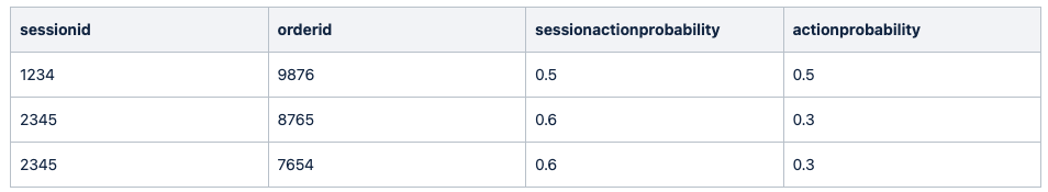- If a session contains only one action, sessionactionprobability and actionprobability will have the same value. If there are multiple actions, such as two orders, the sessionactionprobability remains the same for each action, while the actionprobability is divided among the actions in that session.